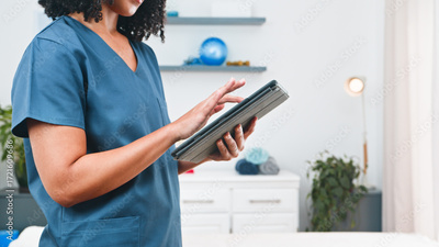Physiotherapist Using Tablet in Clinic, Providing Gentle Sports Therapy and Patient Care During Routine Session