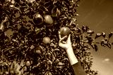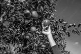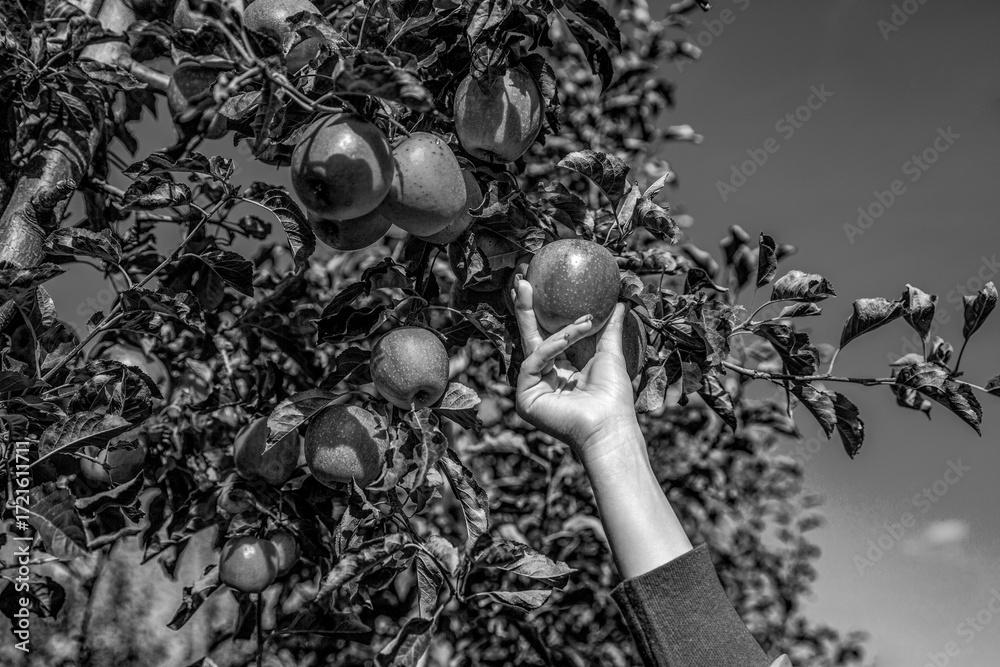 Hands reaches for the apples tree. Female hand holds red apple. Black and white