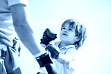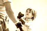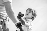 Man coaching boxing little boy in red boxing gloves. Little boy doing boxings exercise grandfather. Black and white