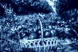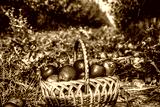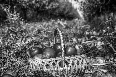 Organic apples in basket in summer grass. Organic fruit in basket in summer grass. Black and white