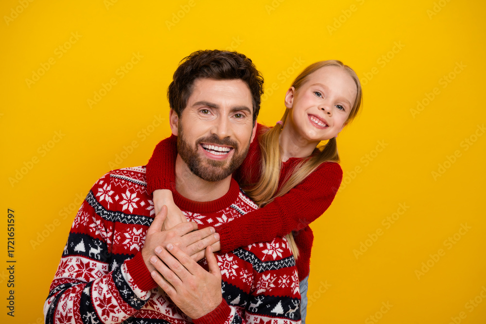 Father and daughter in festive sweaters embrace with joy on a vibrant yellow background, radiating warmth and happiness