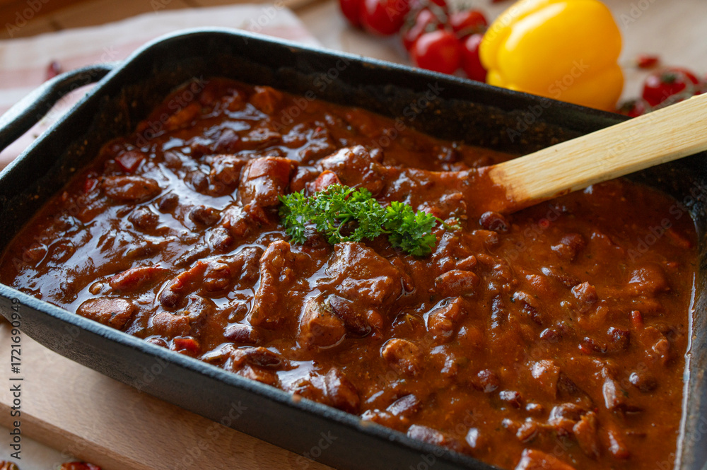 Homemade bean stew with pork meat in a roasting pot