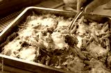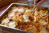 Noodle casserole with meat sauce and mozzarella cheese in a baking dish