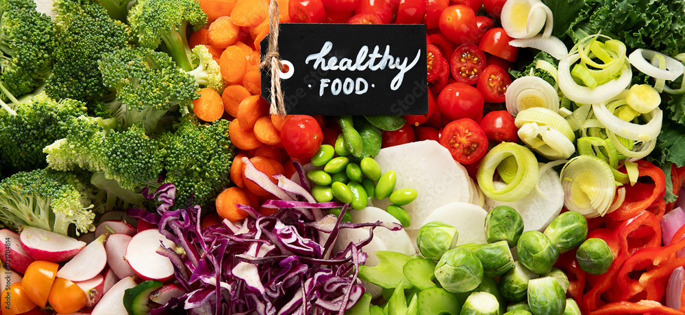 Healthy vegetarian food background. Sliced fresh vegetables.