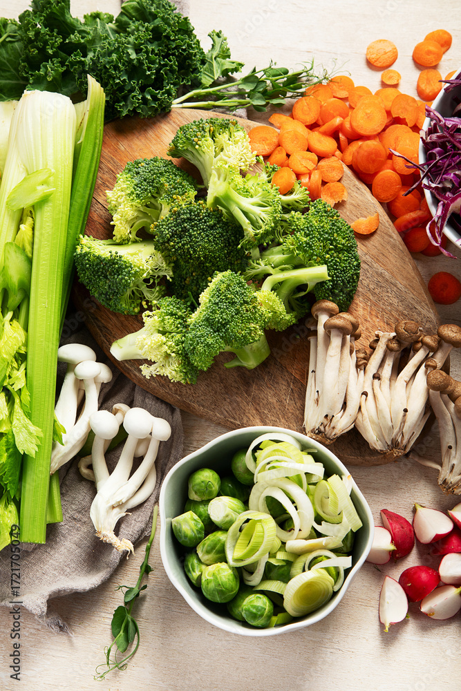 Healthy vegetarian food background. Sliced fresh vegetables.
