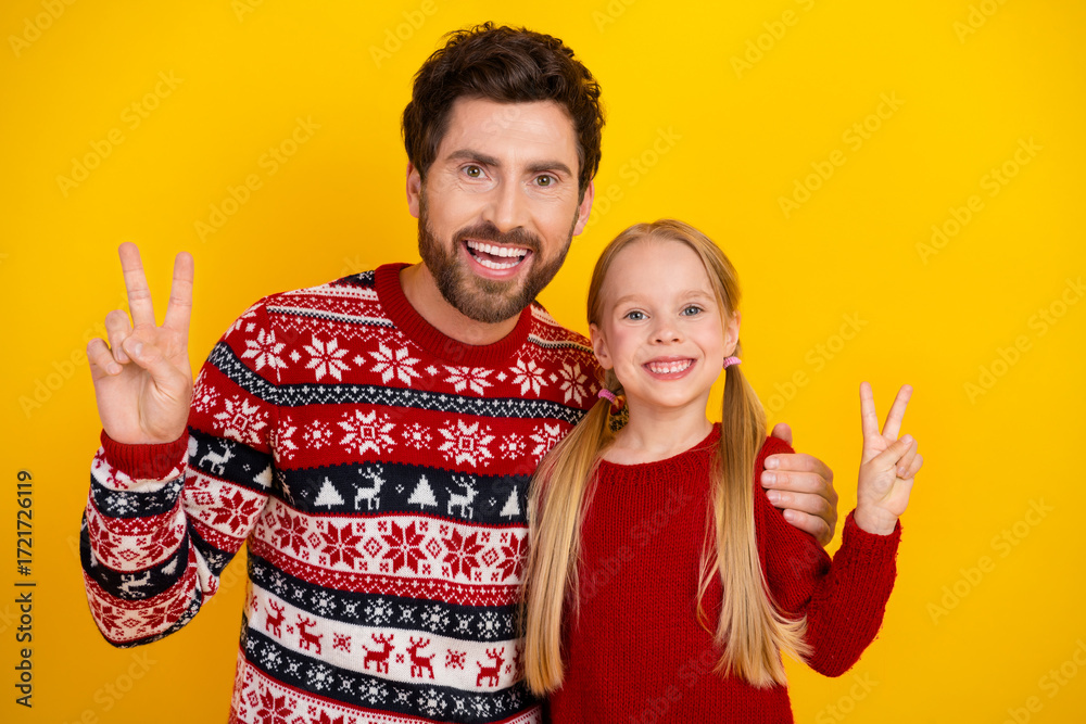 Father and daughter wearing Christmas sweaters joyfully posing together against vibrant yellow background, making peace gestures