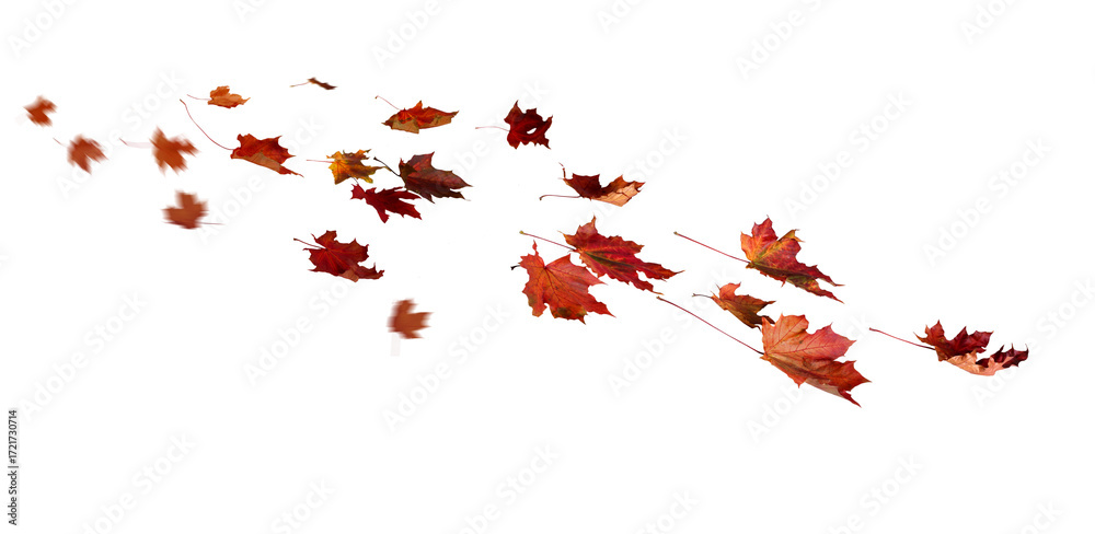 Autumn red falling maple leaves swirl in the wind. Fall leaves png cutouts