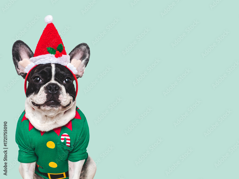 Merry Christmas and Happy New Year. Cute puppy and Christmas elf costume. Closeup, studio shot. Congratulations for family, friends and colleagues. Pet care concept