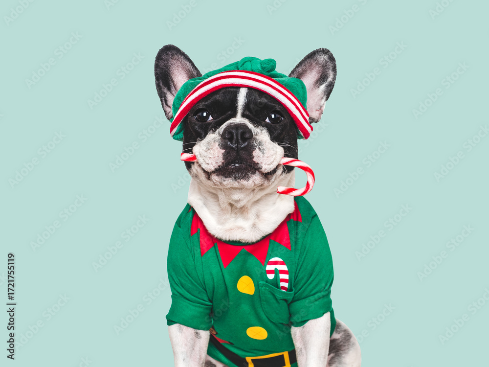 Merry Christmas and Happy New Year. Cute puppy and Christmas elf costume. Closeup, studio shot. Congratulations for family, friends and colleagues. Pet care concept