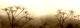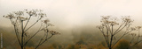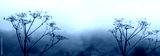 dry branches plant in foggy field, autumn natural abstract background. artistic melancholy nature image. Beautiful fall seasonal landscape in misty morning. banner. soft focus