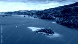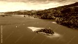 Aerial view of Portschach am Worthersee, Austria, with turquoise lake waters, boats, piers and alpine scenery. Popular summer holiday destination for relaxation, wellness and tourism
