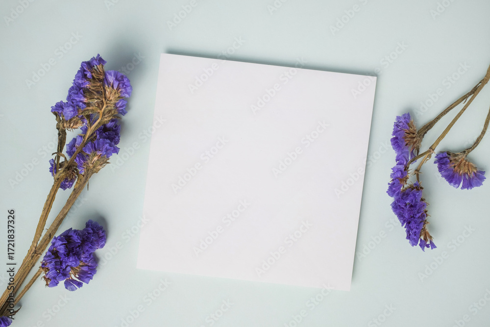 Empty white blank greeting or invitation card with violet flower on blue background.