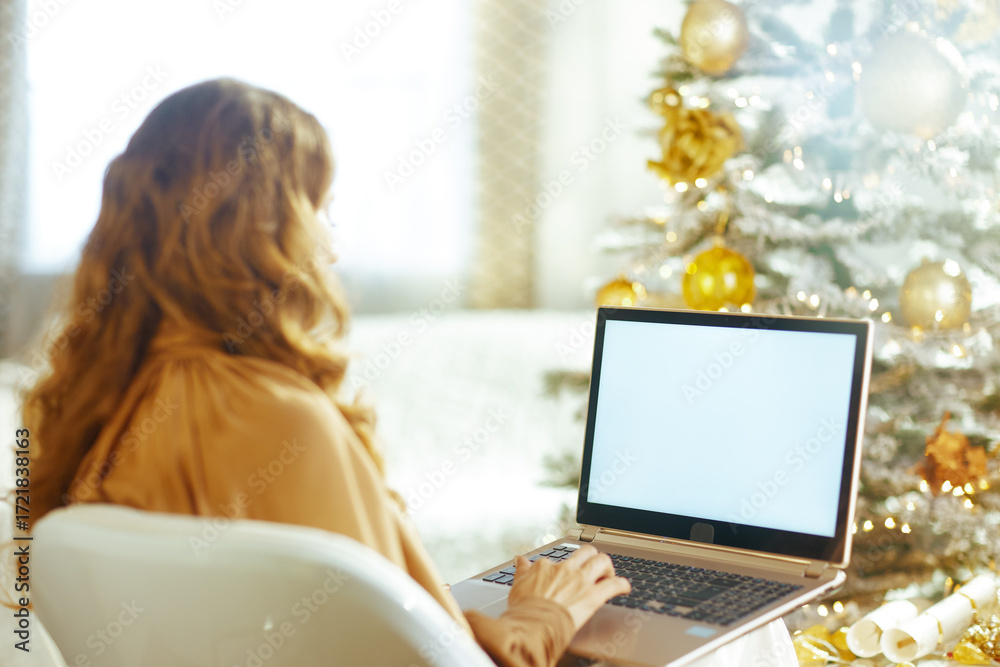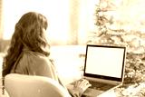 A woman with wavy brown hair, seen from behind, sits in a white chair using a laptop. A decorated Christmas tree with gold ornaments and soft ambient light creates a warm, festive scene.