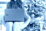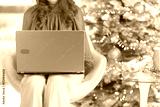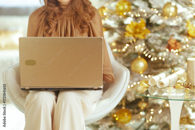 A woman sits comfortably in white armchair, using gold laptop. A blurred Christmas tree with gold ornaments and lights creates cozy, festive backdrop for remote work.
