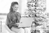 Smiling woman with ponytail sits in white chair, looking at silver laptop. Brightly lit Christmas tree and festive decorations visible in background, creating happy holiday atmosphere.