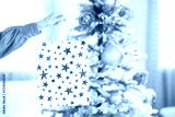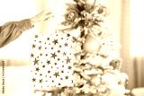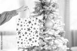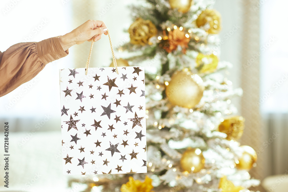 A close-up shows hand in brown puff-sleeved shirt holding white gift bag with black and gold stars. A softly lit, blurred flocked Christmas tree with gold ornaments provides festive holiday background