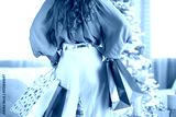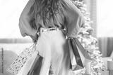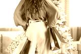 Woman from behind, in beige blouse and cream pants, carries shopping bags before beautifully decorated Christmas tree, evoking festive holiday shopping scene.