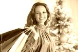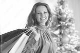 A cheerful woman with brown wavy hair smiles, holding shopping bags over shoulder. A beautifully decorated Christmas tree with golden lights glows softly in background, creating festive holiday scene.