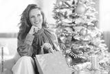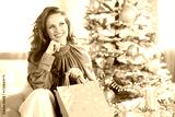 An elegant woman with wavy brown hair smiles while holding a star-patterned shopping bag. She sits before a glowing Christmas tree, bathed in soft, bright light, conveying holiday joy.