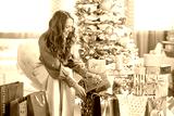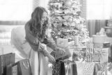 A smiling woman with wavy brown hair places a golden gift into a festive star-patterned bag. Surrounded by opulent Christmas decor and a flocked tree, the scene captures the joy of holiday giving.