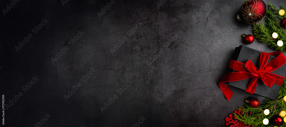 Festive flat lay with a black gift box tied in red ribbon, red baubles, pine branches, and holiday decorations on a dark textured background.