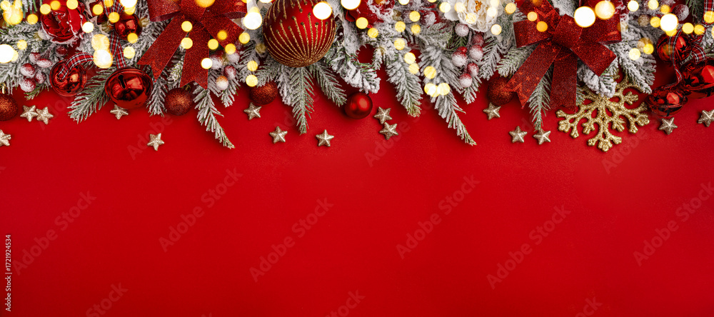 Christmas background with snowy pine branches, red baubles, bells, and festive flowers on a red surface. Ideal for holiday cards, banners, invitations, winter promotions, and seasonal ads