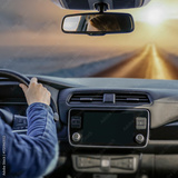 Close-up of female hands on the steering wheel while driving car. Snowy winter road visible through the windshield. Transportation, travel and journey forward on frosty day.
