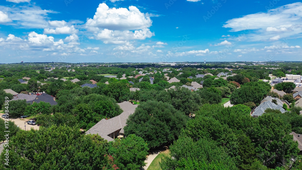 Roof shingles of two-story suburban houses nested in lush green trees in Colleyville, Texas tree-lined streets, sloped-roof homes, landscaped yards, dense greenery in grid layout, suburbs Dallas
