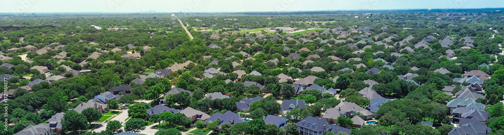 Panorama aerial view downtown Fort Worth Texas background from Colleyville, residential street along row upscale two-story suburban homes nestled in mature trees, pools, dense greenery backyard
