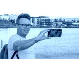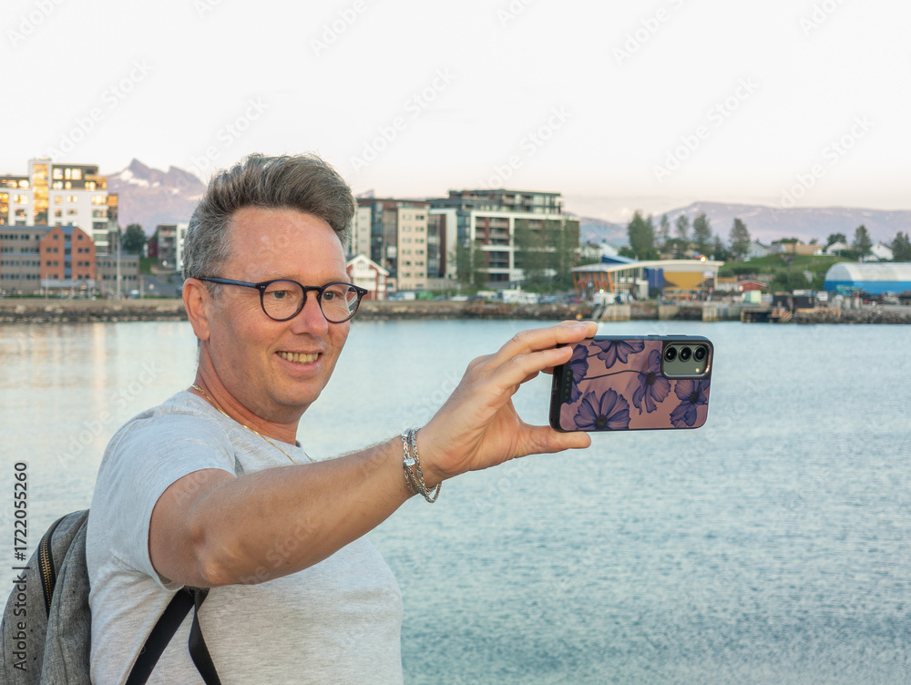Caucasian tourist taking a selfie with his smartphone during evening in Bodø, Norway. Yachts in the harbor of Bodo in the background. Norwegian city, solo traveller taking photo with cellphone.