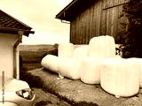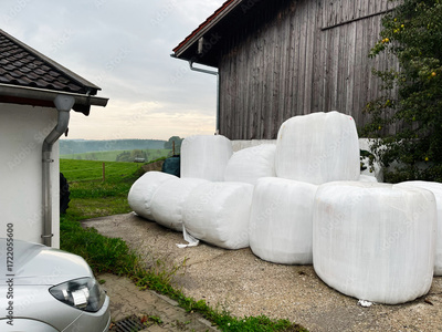 White wrapped hay bales near rustic barn in rural Germany countryside landscape