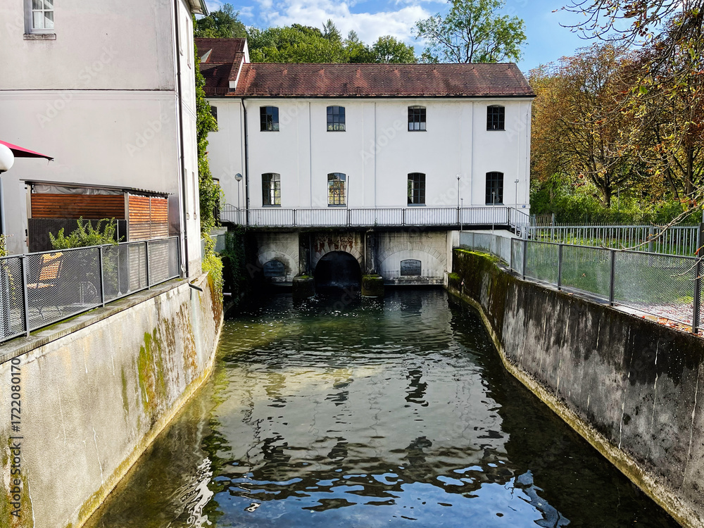 Canal side building over water in Furstenfeldbruck Germany with arches and white facade