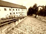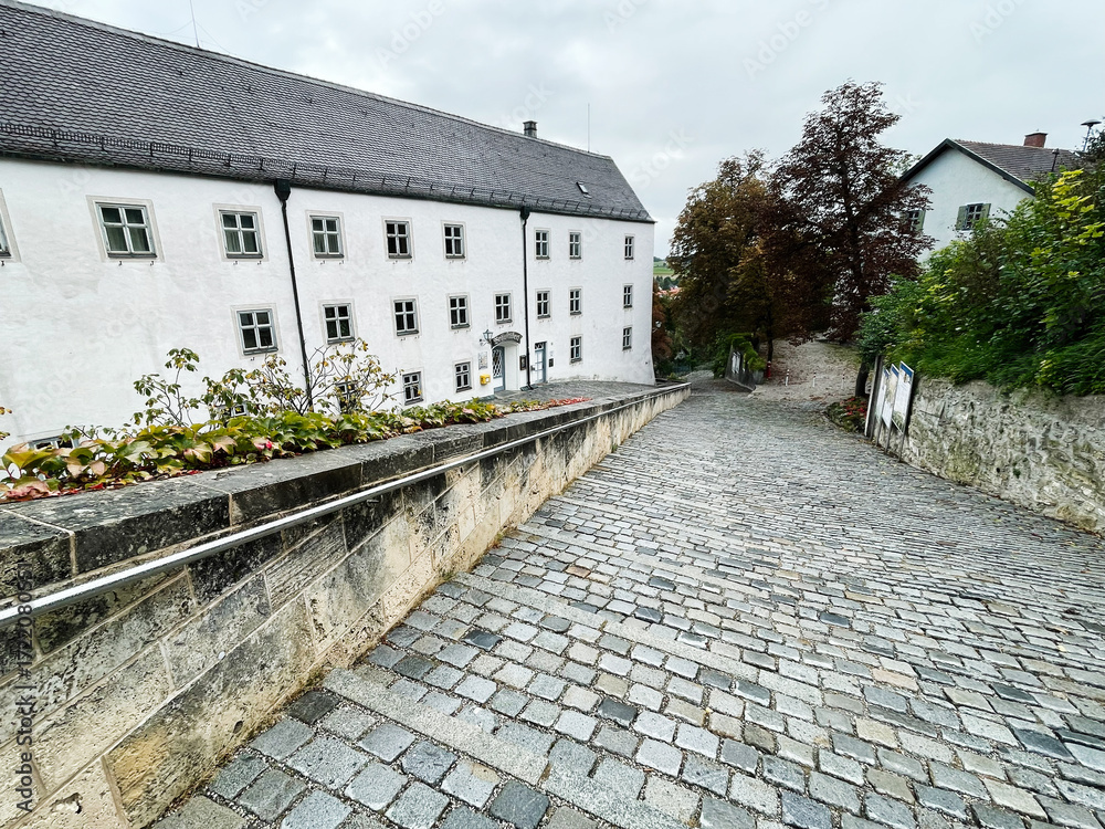 Quiet cobblestone street in Andechs, Germany with white historic building and tree lined slope