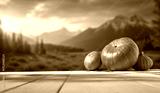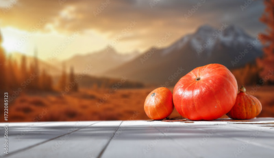 Rustic autumn still life with pumpkins placed on wooden table, blurred fall landscape with autumn background. Seasonal marketing, farm-to-table concepts and thanksgiving themes.