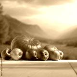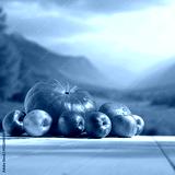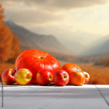 Rustic autumn still life with pumpkin and fresh apples placed on wooden table, blurred fall landscape with autumn background. Seasonal marketing, farm-to-table concepts and thanksgiving themes.