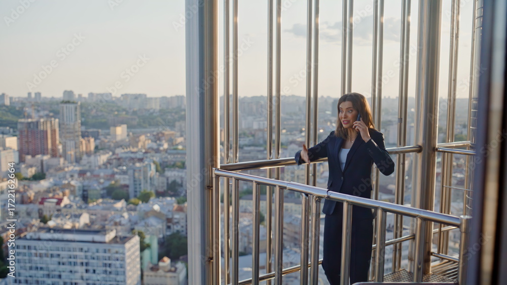 Happy manager speaking cellphone standing office balcony. Smiling businesswoman