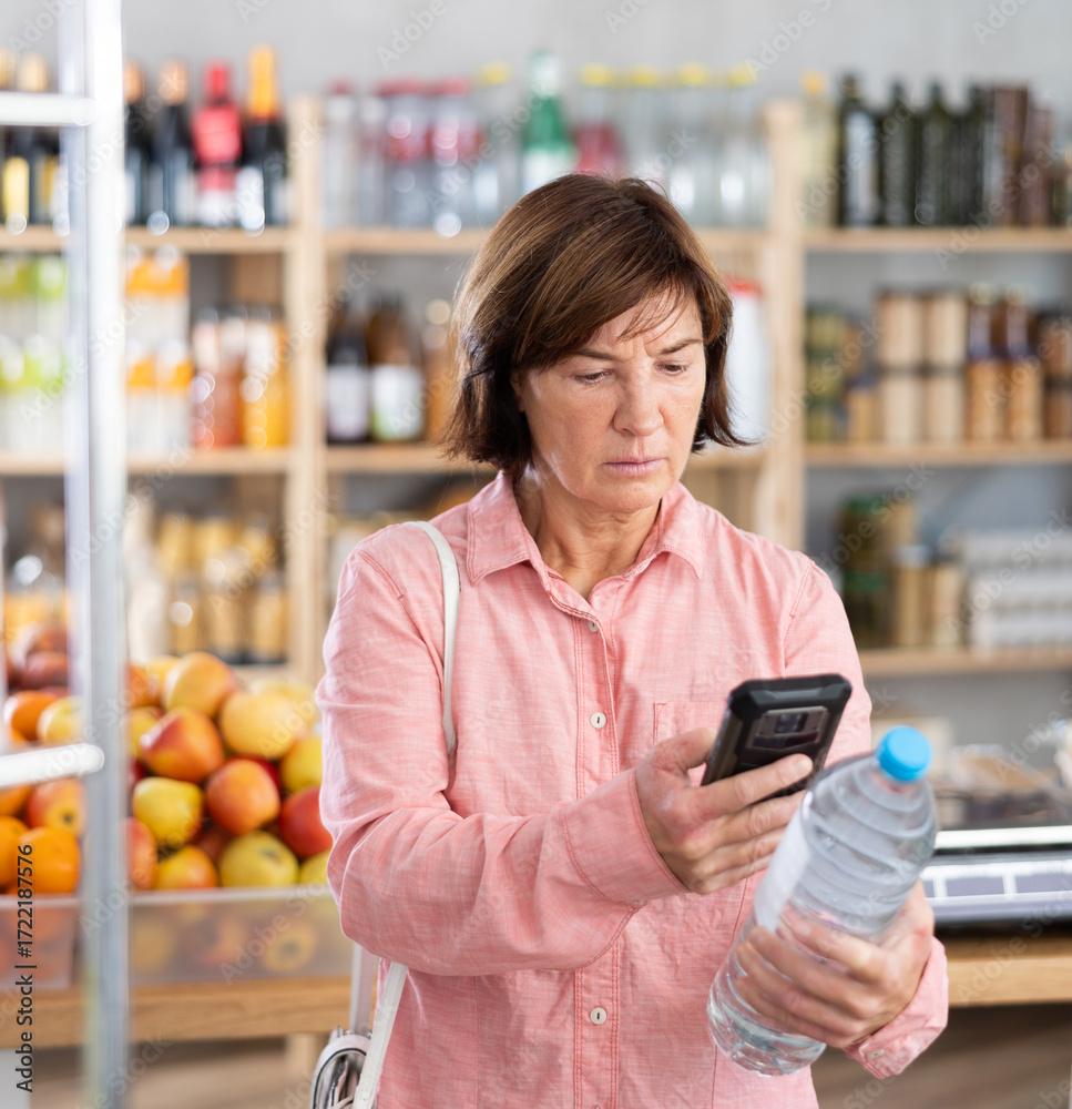 Female buyer checks suitability - scans QR code on bottle of water label in a grocery store