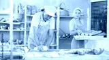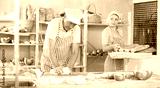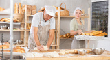 Senior man works in bakery as baker, kneads dough, works with flour. Working moment, process of creating croissants in bakery