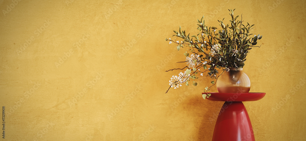 Vase with green plant on yellow concrete wall background with copy space. 3D Rendering, 3D Illustration