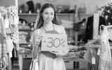 Portrait of smiling woman holding sign saying 30 percent discount in clothing store