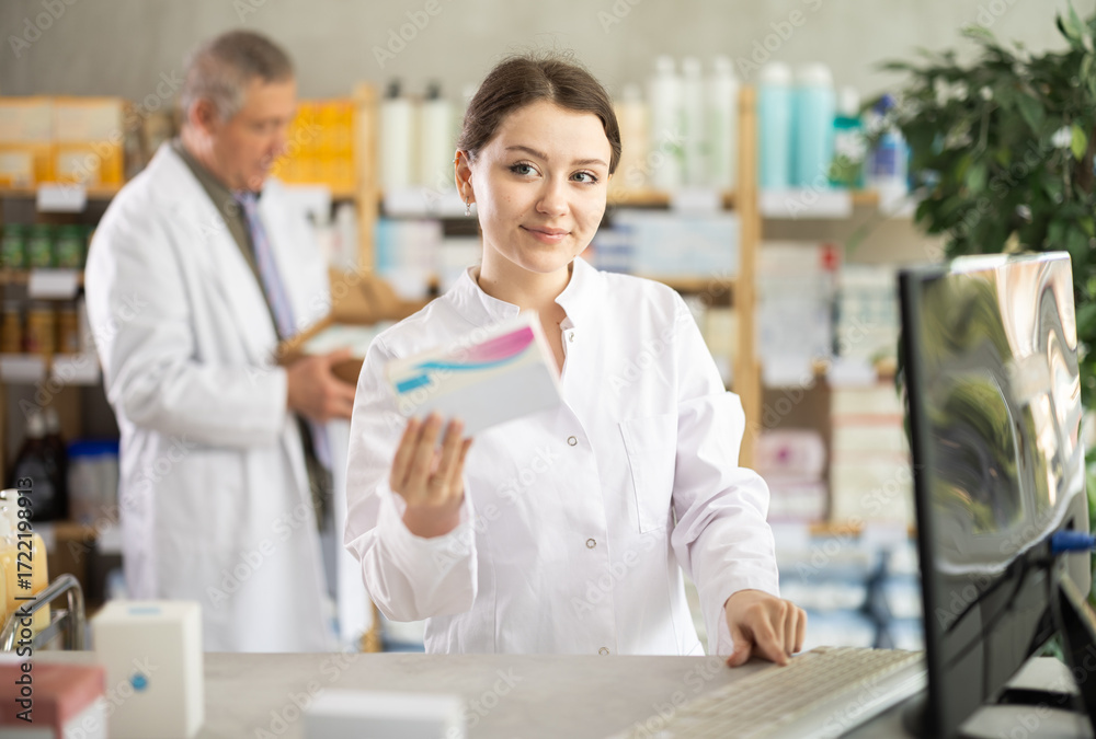 Friendly female pharmacist standing at drugstore with medical product in hands