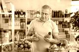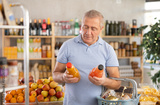 Concerned old man is deciding between kinds of bottled juice in the supermarket
