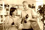 Couple of elderly man and elderly woman choosing olive or sunflower oil in bottle in grocery store