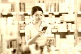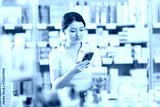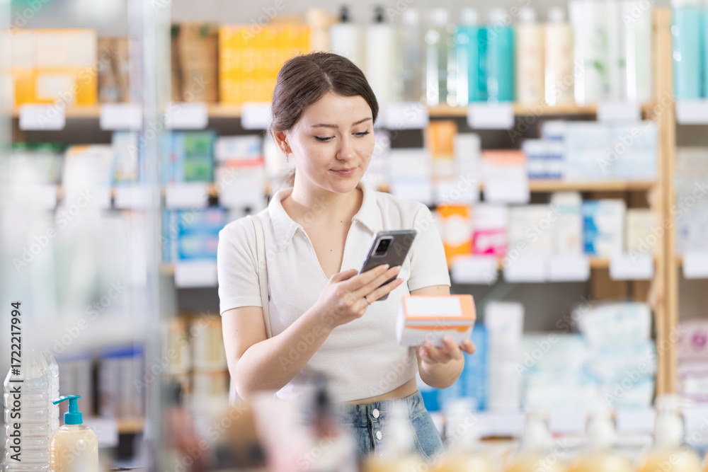 Young woman shopping in pharmacy scanning barcode on box of pills with smartphone, carefully checking dosage, side effects, or contraindications before purchase, ensuring safe self-medication