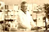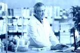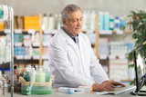 Senior man is a pharmacist typing on a computer, bringing in new goods and medicines. Pharmacy employee carefully works at the computer and checks online orders