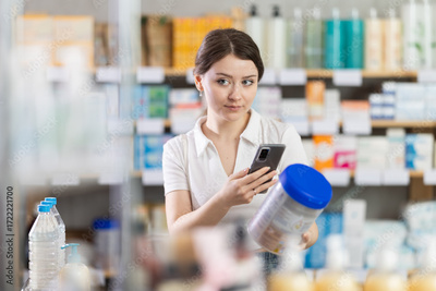 Young woman buyer scanning qr code for baby formula in pharmacy