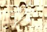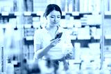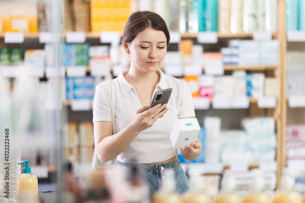 Young woman buyer scanning qr code for box of pills in pharmacy
