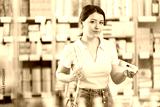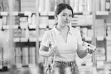 Girl in summer clothes buys medicinal ointment at a pharmacy