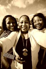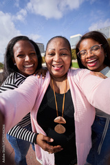 Vertical. African plus size mother smiling with her two millennial daughters while taking a cheerful selfie outdoors in the city, showing love, diversity, family connection and happiness.