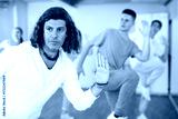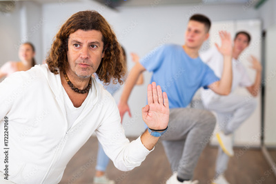 Adult positive man learning dance moves in dance hall